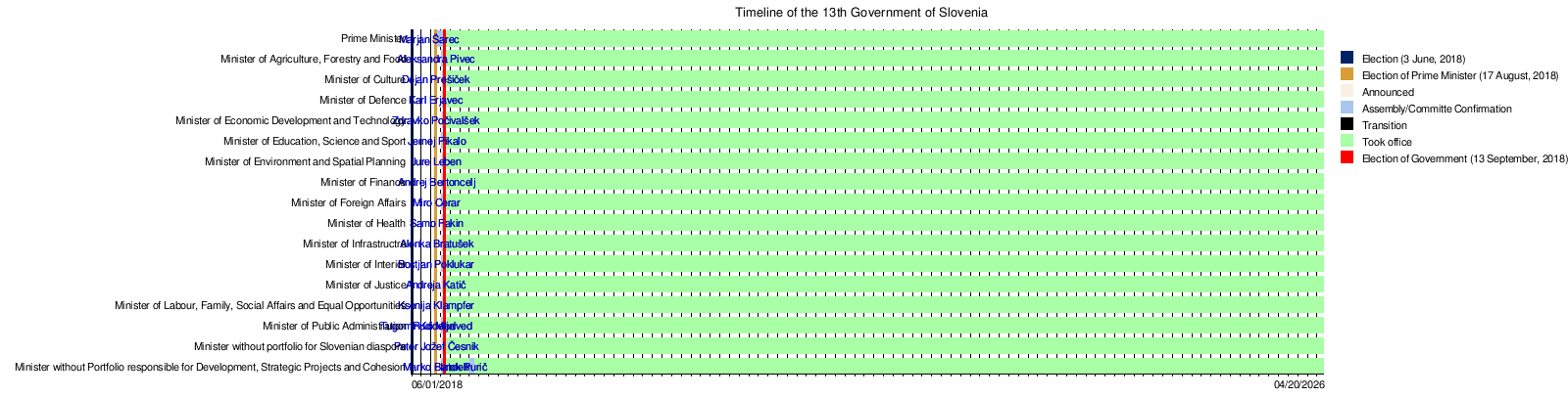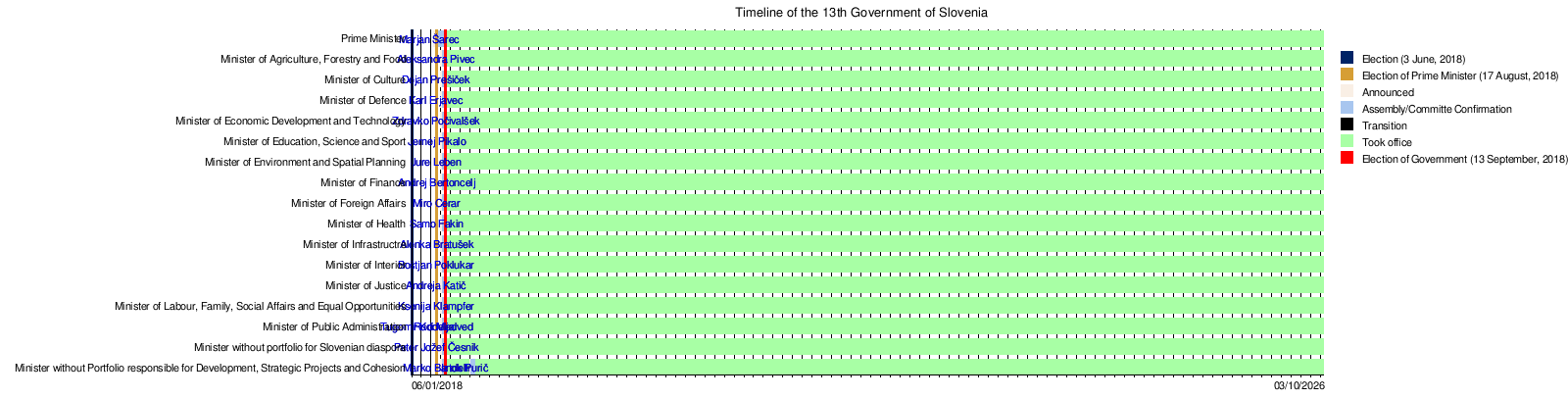 This timeline shows key dates for the 13th Government of Slovenia, including when elections happened and when ministers took office.