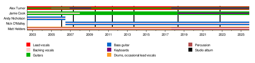 Arctic Monkeys are a famous rock band from Sheffield, England. They started making music in 2002. The band members are Alex Turner (lead singer), Matt Helders (drummer), Jamie Cook (guitarist), and Nick O'Malley (bassist). Their first bassist, Andy Nicholson, left the group in 2006.