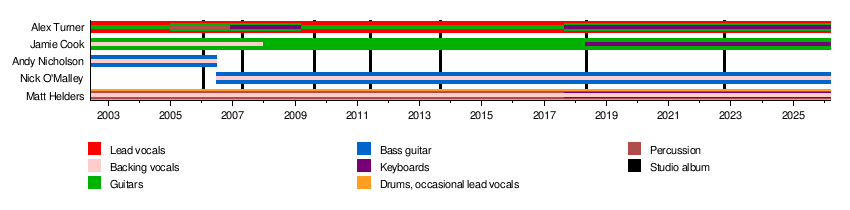 At first, Alex played guitar, Matt played drums, and Andy played bass. Jamie Cook joined as a second guitarist. Alex was shy about being the lead singer, but he was good with words, so he eventually took on that role.