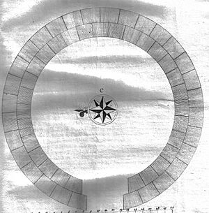 Inside, the building was circular, with a paved stone floor. There were two decorative stone bands, called string courses, around the interior walls. These were about 4 feet and 6 feet (1.2 and 1.8 meters) above the floor.