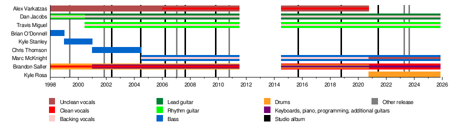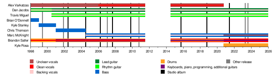 Today, the band members are Brandon Saller (who sings the main vocals), Dan Jacobs and Travis Miguel (who play guitar), Marc "Porter" McKnight (who plays bass and sings louder, more aggressive vocals), and Kyle Rosa (who plays drums). Atreyu has released eight studio albums.