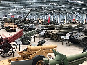 The museum has artillery pieces that are very old, some even from World War I. It also displays vehicles from World War II and later. In total, the museum owns over 100 vehicles. More than 190 different exhibits are on display for visitors to see. Some vehicles are also being fixed up or are on their way to the museum. The collection includes many types of armoured vehicles. You can find examples from Germany, the US, Australia, Britain, and Russia.