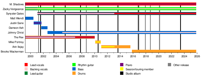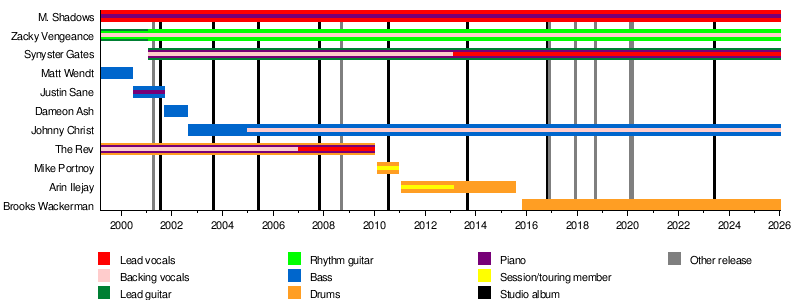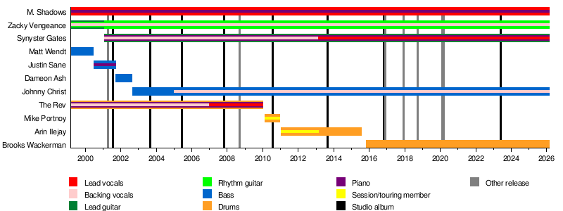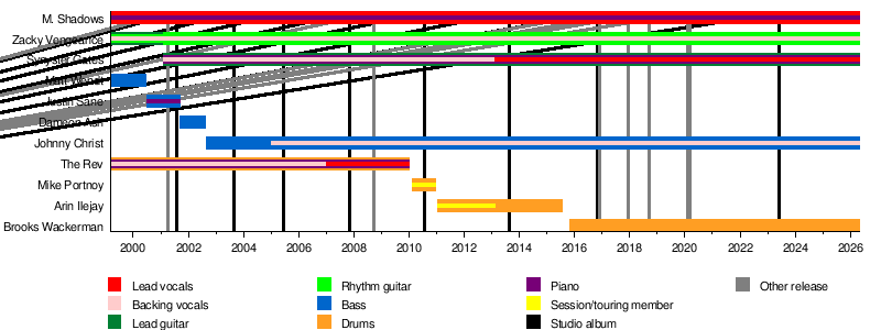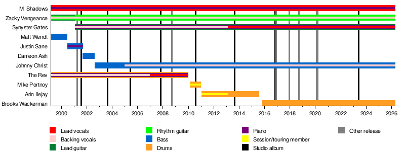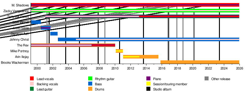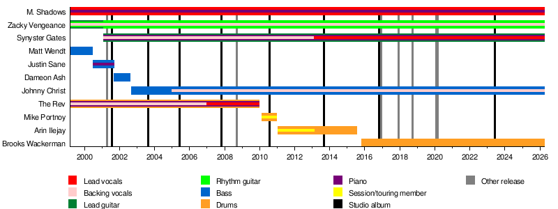 The current members are M. Shadows (singer), Zacky Vengeance (rhythm guitar), Synyster Gates (lead guitar), Johnny Christ (bass), and Brooks Wackerman (drums).