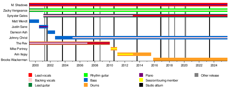 ![]() Avenged Sevenfold in 2016. From left to right: M. Shadows, Zacky Vengeance, Johnny Christ, Synyster Gates, and Brooks Wackerman