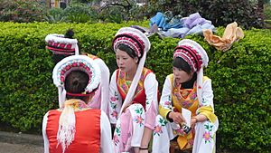 Most Bai people live in the Dali Bai Autonomous Prefecture in Yunnan province. This area is known for its stunning mountains and clear lakes. The Erhai Lake is a very important natural landmark there. The Bai people have lived in this region for thousands of years. They have built their homes and communities around these beautiful natural settings.