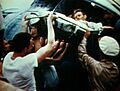 Ensign George Gay (right), sole survivor of VT-8's TBD Devastator squadron, in front of his aircraft, 4 June 1942.