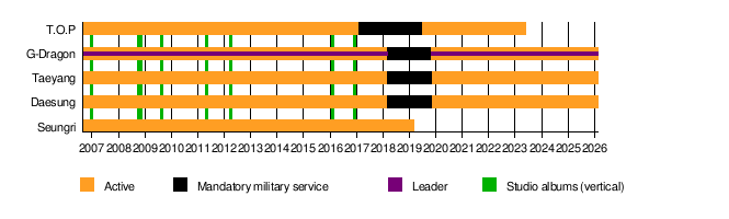 On December 27, 2022, YG confirmed that Daesung had ended his contract. He was looking for a new start. On May 31, 2023, T.O.P shared that he had "already withdrawn" from the group.