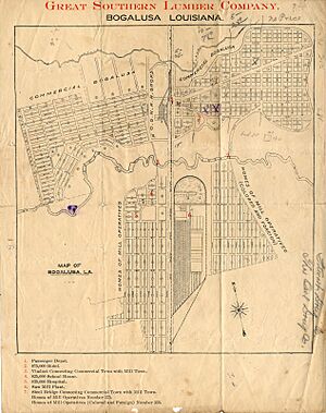 The city's name comes from the Choctaw language words bogue lusa. This means "dark water" or "smoky water" in English. Bogalusa is in an area with many pine forests. In the early 1900s, it was built as a special "company town." This meant it was created to provide homes and services for workers of a large Great Southern Lumber Company sawmill. Later, in the late 1930s, paper mills and chemical factories took over as the main industries.