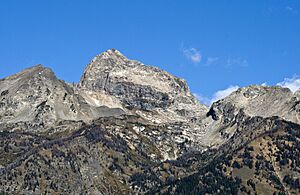 Buck Mountain is the highest peak south of Garnet Canyon. It is easy to spot from many places in Jackson Hole. If you reach the top, you get amazing views of the Cathedral Group to the north. The western side of the mountain is near the Alaska Basin Trail. This trail leads into Caribou-Targhee National Forest and the Jedediah Smith Wilderness. Alaska Basin is a popular spot for backpackers to camp. Timberline Lake is also found on the eastern side of the mountain.