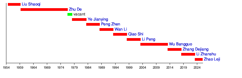 From 1998 to 2013, the Chairman of the NPCSC was often the second most powerful person in the Politburo Standing Committee of the CCP. This committee is made up of the most powerful leaders in China. Today, the Chairman ranks below the leader of the Chinese Communist Party (the CCP General Secretary) and the President. The current Chairman is Zhao Leji. He is the third-highest ranking member of the Politburo Standing Committee.
