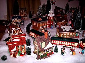 A Christmas village is a fun, miniature display of buildings and scenes. People often set them up during the Christmas season. These tiny villages are sometimes called a putz. The idea for them comes from old Christmas traditions of the Moravian church, which is a type of Protestant church.