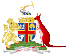 | Blazon | Azure on an Inescutcheon Argent upon a Cross of St. George cottised of the field five six pointed Stars of the second (representing the Constellation of the Southern Cross) all within an Orle of Inescutcheons of the second, each charged with a Chevron Gules |