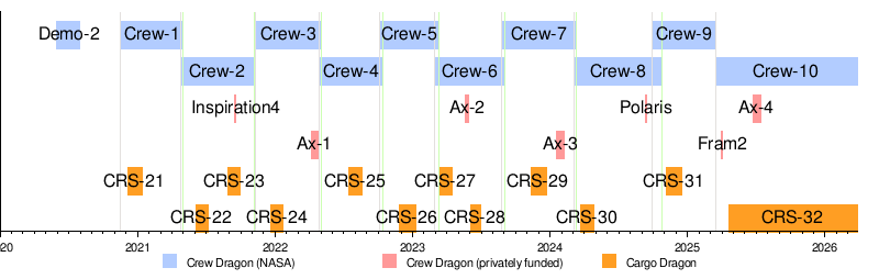 | Polaris-2 | TBA | TBA | TBA | TBA | Pacific Ocean (planned) | This will be the last Polaris Program flight to use Crew Dragon. |