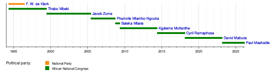 From 1994 to 1996, South Africa had a special "Government of National Unity." During this time, a member from the second-largest political party could also be a Deputy President. For example, F. W. de Klerk, who was the previous State President, served as Deputy President alongside Thabo Mbeki. De Klerk was the leader of the National Party, which was the second-largest party then. He later left this role. Even after 1996, the government can still work together with other parties, but no opposition politicians have been appointed as Deputy President since then.