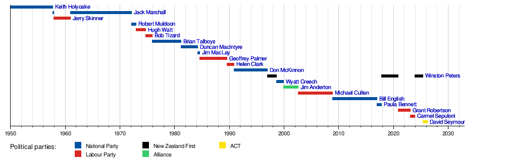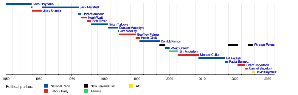 Here is a list of the people who have served as Deputy Prime Minister of New Zealand. The colors show which political party they belonged to.