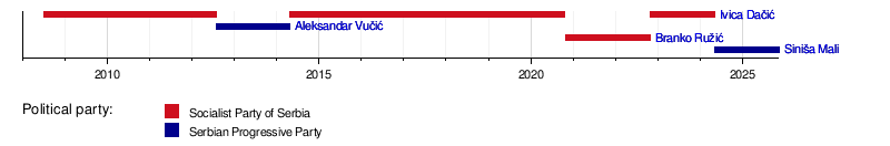 SDPS | 27 July 2012 | 28 October 2020 | Trade, Tourism, and Telecommunications | Dačić (I) Vučić (I • II) Brnabić (I) |