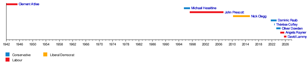 In 2021, Dominic Raab was appointed Deputy Prime Minister under Boris Johnson. He had previously stepped in for Mr. Johnson in 2020 when the Prime Minister was unwell. After Mr. Johnson, Thérèse Coffey briefly held the role in 2022, becoming the shortest-serving Deputy Prime Minister. When Rishi Sunak became Prime Minister, he reappointed Mr. Raab. After Mr. Raab resigned in April 2023, Oliver Dowden took over. Following the 2024 general election, Angela Rayner became Deputy Prime Minister in Keir Starmer's government. She was then succeeded by David Lammy on 5 September 2025.