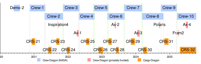 C207 | Resilience | Crew | Active | 4 | 167d 6h 29m (Crew-1) | 178d 19h 17m | First flew on Crew-1. It has also flown private missions like Inspiration4, Polaris Dawn, and Fram2. | ![]() |