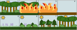 2. A disturbance, such as a wild fire, destroys the forest