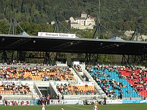 The Rheinpark Stadion in Vaduz is the national stadium of Liechtenstein. It is where the Liechtenstein national football team plays its home matches. It is also the home stadium for FC Vaduz. The stadium is right next to the River Rhine, very close to the border with Switzerland. It has 5,873 seats and extra standing room, making its total capacity 7,584. The stadium cost about 19 million Swiss francs to build.