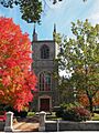 The church has a tall steeple with four pointy tops called pinnacles. Inside the steeple is a bell from 1804, which came from the church that was here before. The main worship area, called the sanctuary, was made bigger in 1869. A small chapel was also added then. Later, in 1965, another part was built on the east side of the church.