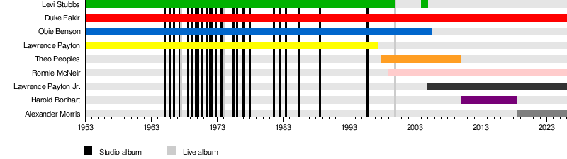 At first, Levi Stubbs, Renaldo "Obie" Benson, and Abdul "Duke" Fakir performed as a trio. In 1998, they asked Theo Peoples (who used to be in the Temptations) to join. This made them a quartet again. Later, Levi Stubbs became ill. Ronnie McNeir joined the group, and Theo Peoples became the lead singer. Levi Stubbs passed away on October 17, 2008.