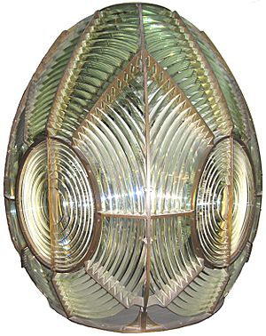 High-quality glass Fresnel lenses were very important in lighthouses during the late 1800s and early 1900s. Most are no longer in use today. Lighthouse Fresnel lenses often had extra prisms above and below the main lens. These prisms helped gather all the light from the lamp. They could even use Total internal reflection to make the light brighter. These lenses allowed lighthouses to send light much farther and in specific patterns, which helped sailors know where they were.