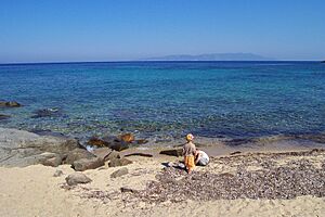 The highest point on the island is called Poggio della Pagana, which is 496 meters (1,627 feet) high. Most of the island, about 90%, is covered in Mediterranean plants. You'll also find large pine forests and many vineyards here. These vineyards help make a special local wine called "Ansonaco."