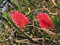 The flowers are a bright red color. They grow in bottlebrush-like spikes, which are about 40 to 80 mm (1.6 to 3.1 inches) long and 50 mm (2 inches) wide. These spikes appear on the side branches of the plant. The petals are small, about 3 to 4.5 mm (0.1 to 0.2 inches) long, and they fall off soon after the flower opens. The bright red color of the flowers comes from their many stamens. These stamens are grouped into five bundles, with each bundle having 11 to 15 stamens.