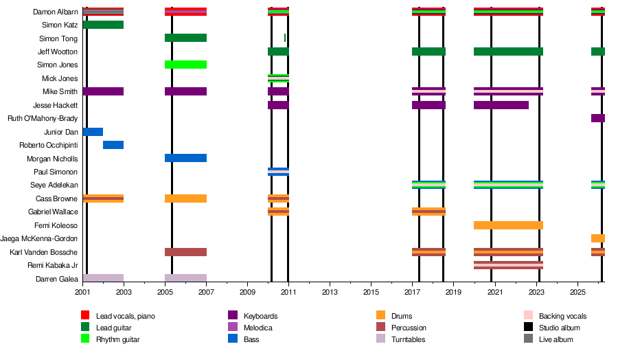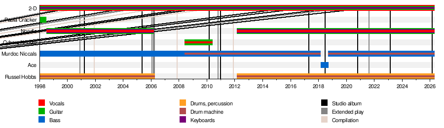 - 2-D – lead vocals, keyboards, guitar (1998–present)