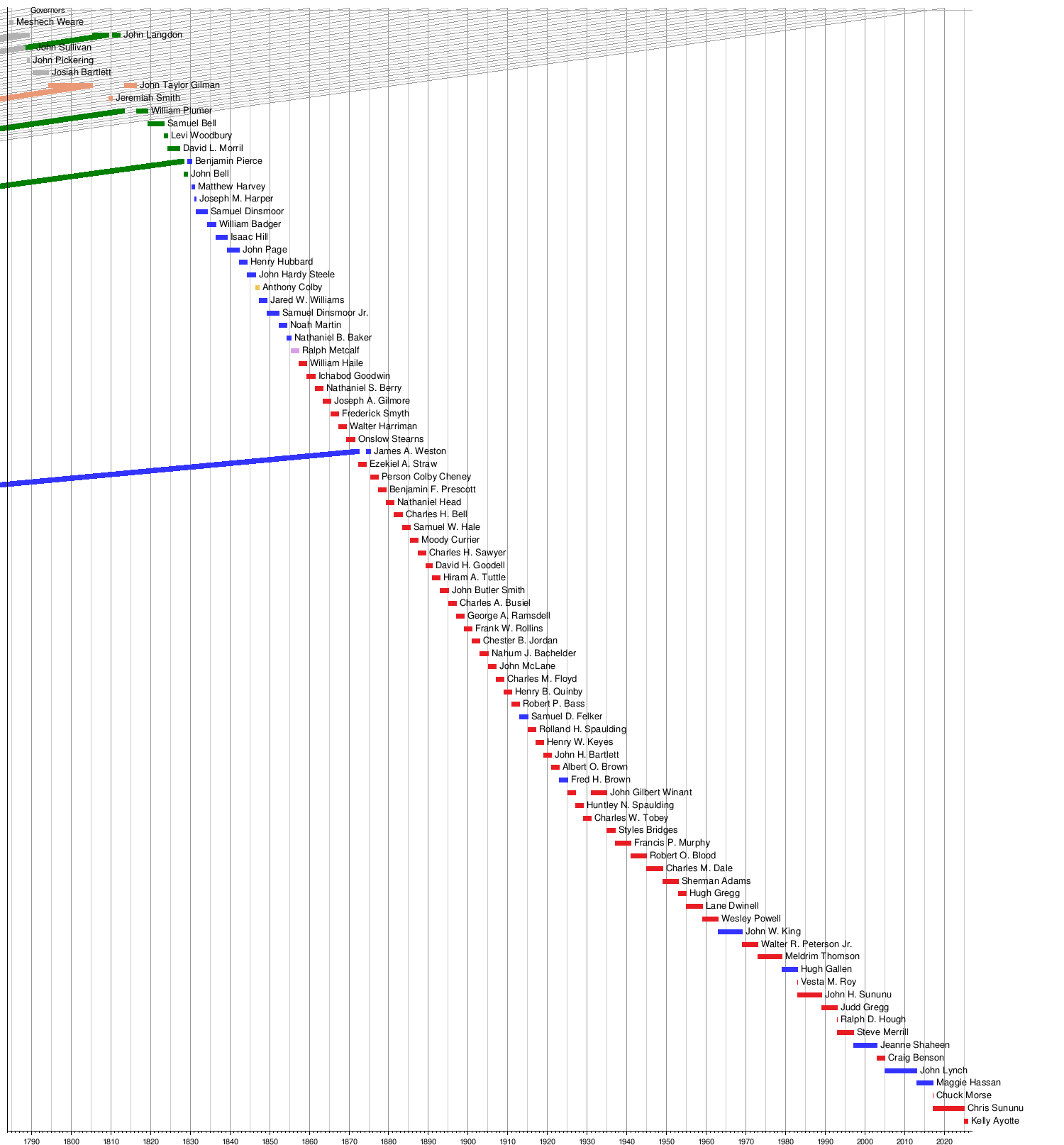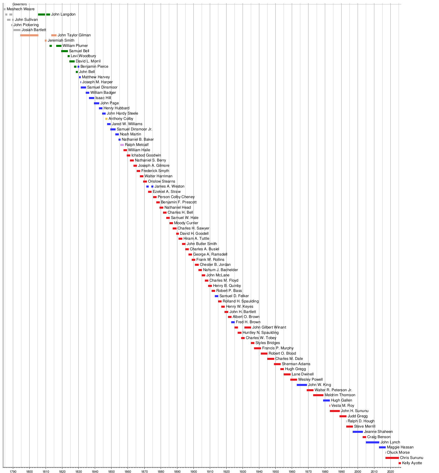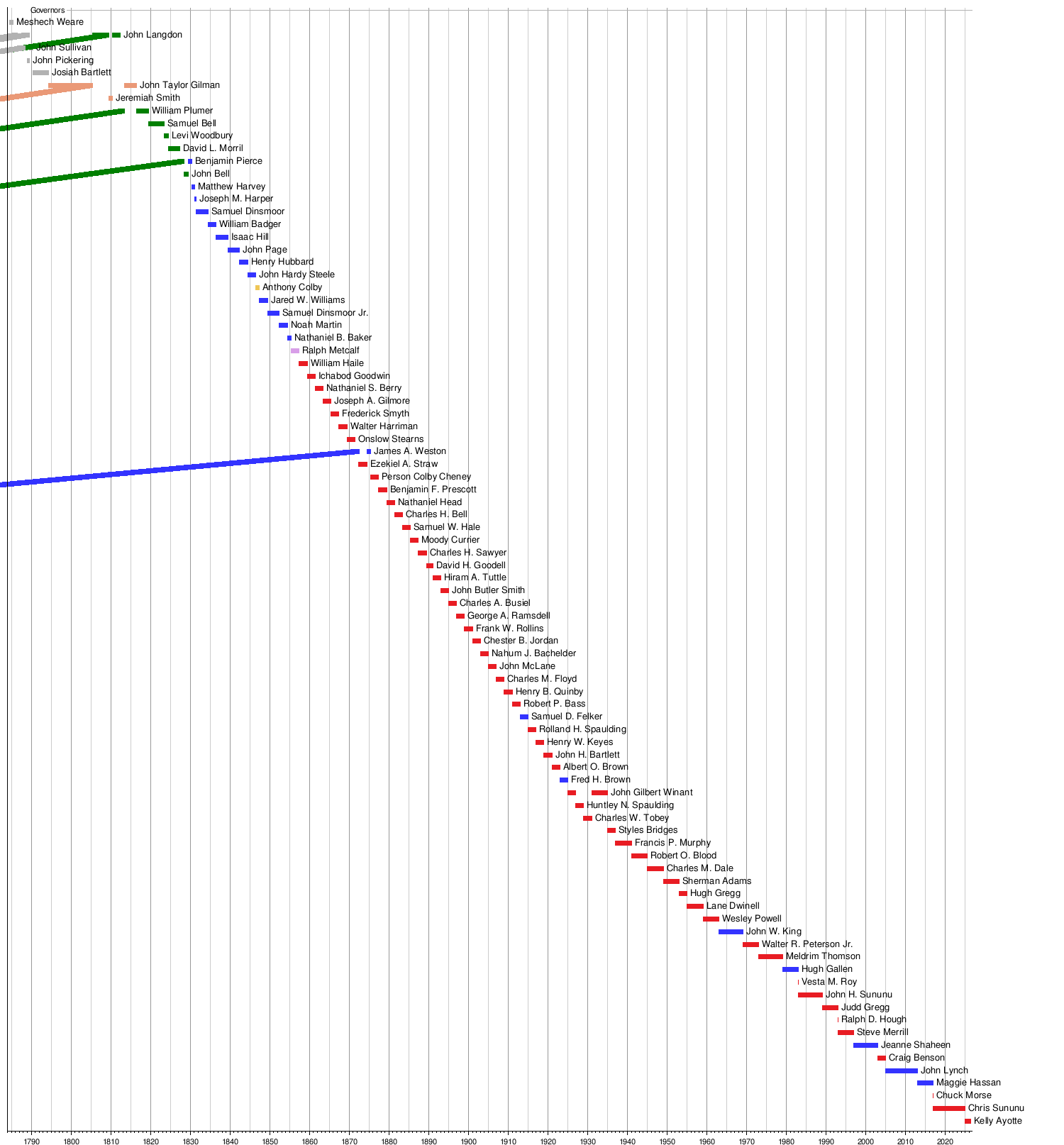 This timeline shows when different people served as governor of New Hampshire.