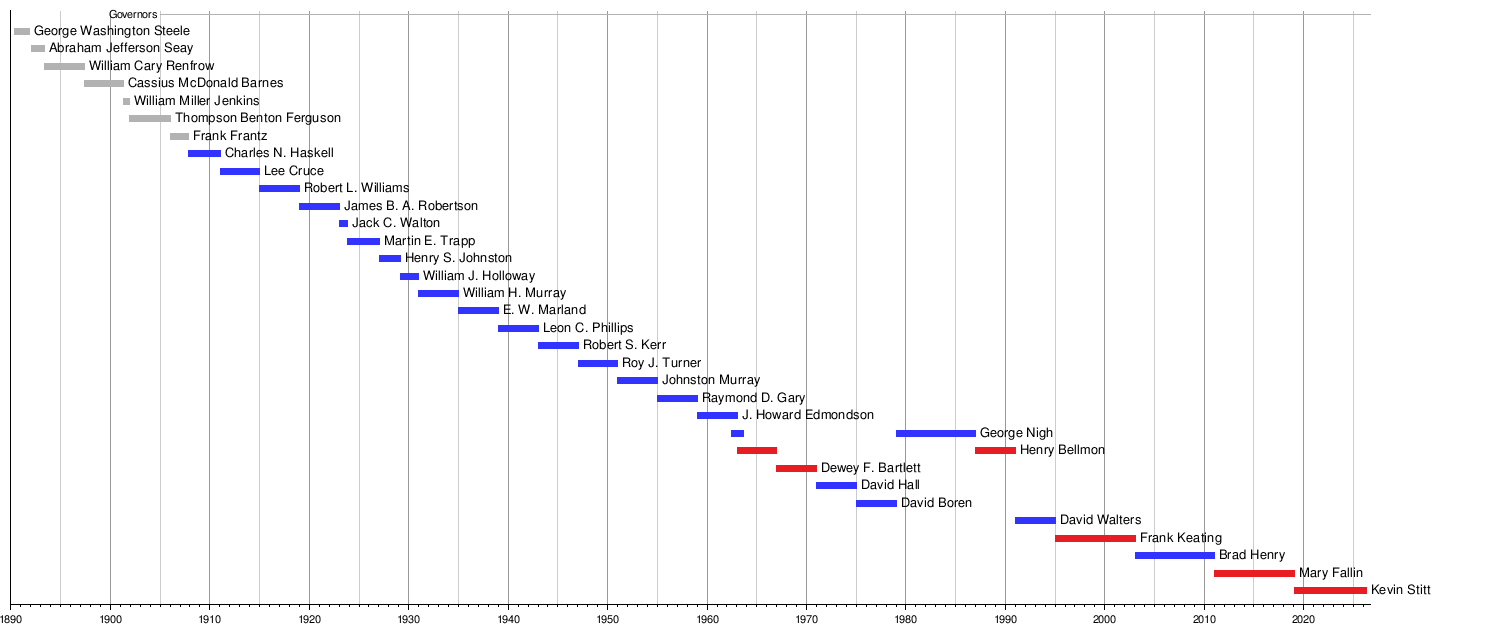 Oklahoma's first state governor was Charles N. Haskell. He served from 1907 to 1911. He was a strong leader. But in the years after him, the Oklahoma Legislature made the governor's job less powerful. Two governors, Jack C. Walton and Henry S. Johnston, were even removed from office.