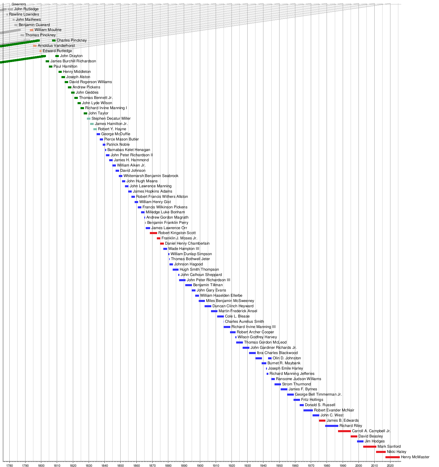 After the American Revolution, from 1776 to 1779, the leader of South Carolina was called the "President." The state's lawmakers chose this person. John Rutledge and Rawlins Lowndes were the only two to hold this title. After 1779, the title changed back to "Governor."
