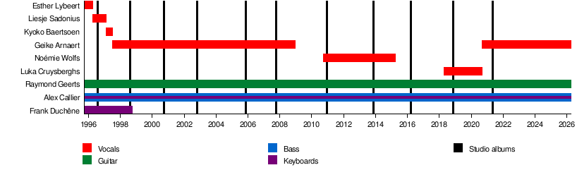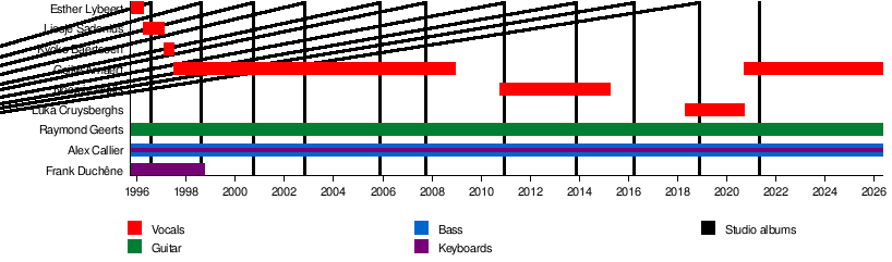 Since they began, Hooverphonic has always had bassist Alex Callier and guitarist Raymond Geerts. They have had different lead singers over the years. Some well-known singers include Liesje Sadonius (1996–1997), Geike Arnaert (1997–2008, and again from 2020 to now), Noémie Wolfs (2010–2015), and Luka Cruysberghs (2018–2020).