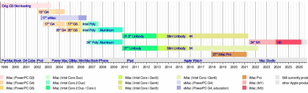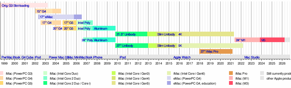 | Timeline of iMac and eMac models (sorted by screen sizes) |