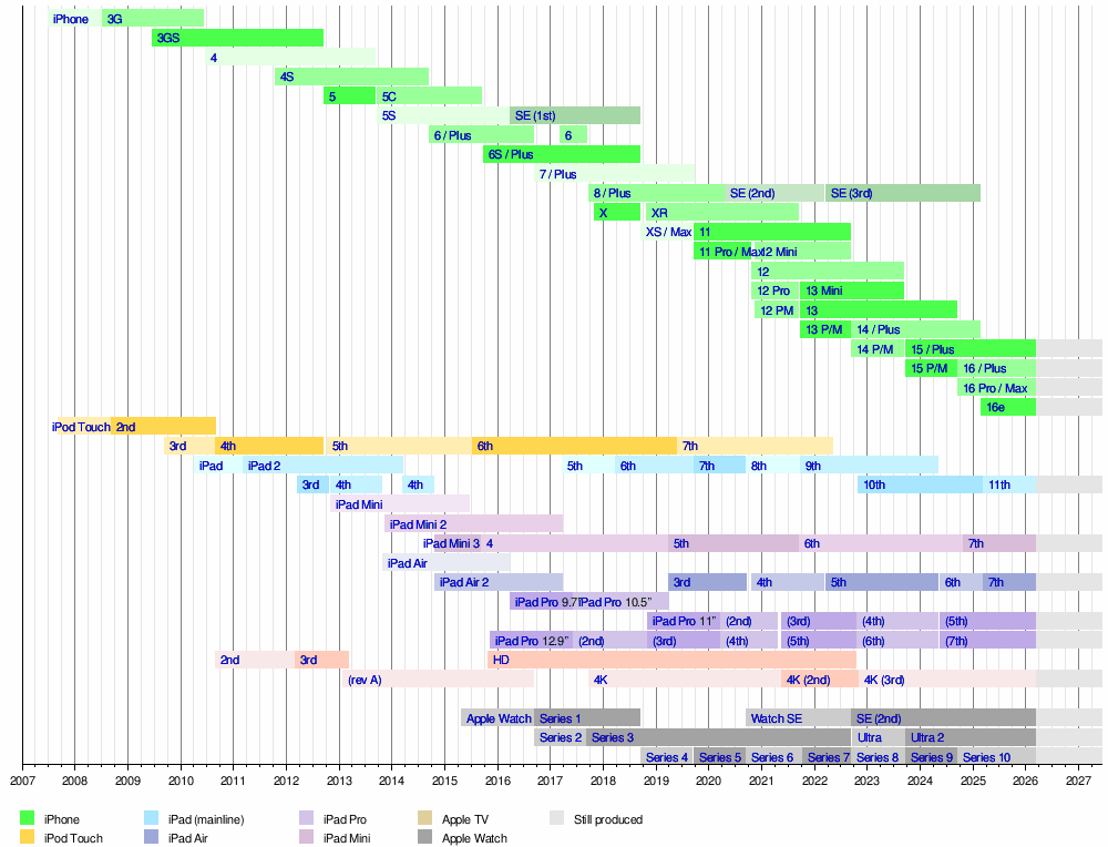 | Timeline of iOS devices: iPhone, iPod Touch, iPad, Apple TV, and Apple Watch models |