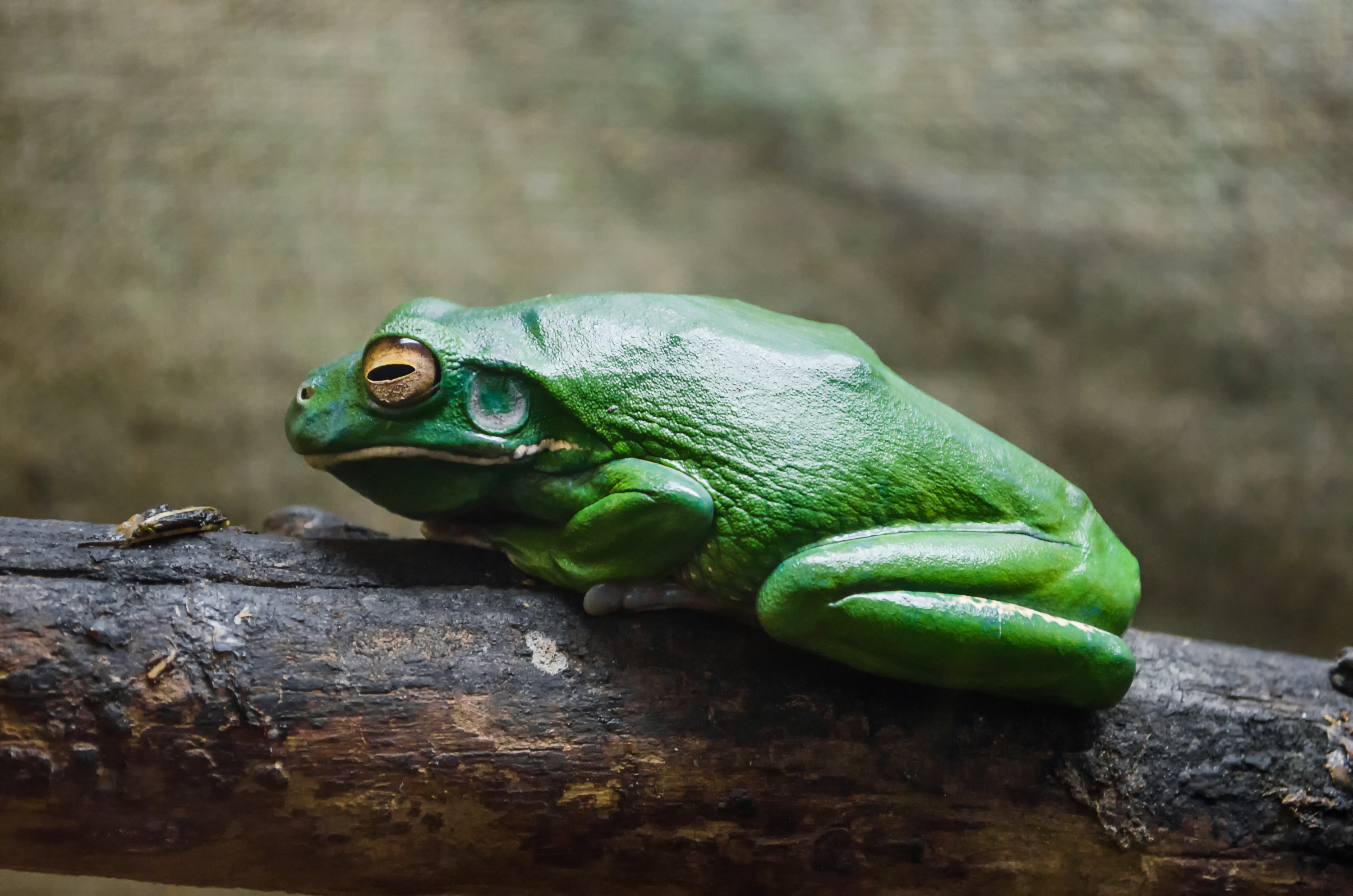 Description: The white-lipped tree frog (Litoria infrafrenata) was found in Australia in 1867 by Albert Günther. It is the world biggest tree frog. The specie is common for tropical areas. It can be capt as a pet, but in some countries it requires an official permit. This particular specimen is maintaining in the Kyiv zoo.
