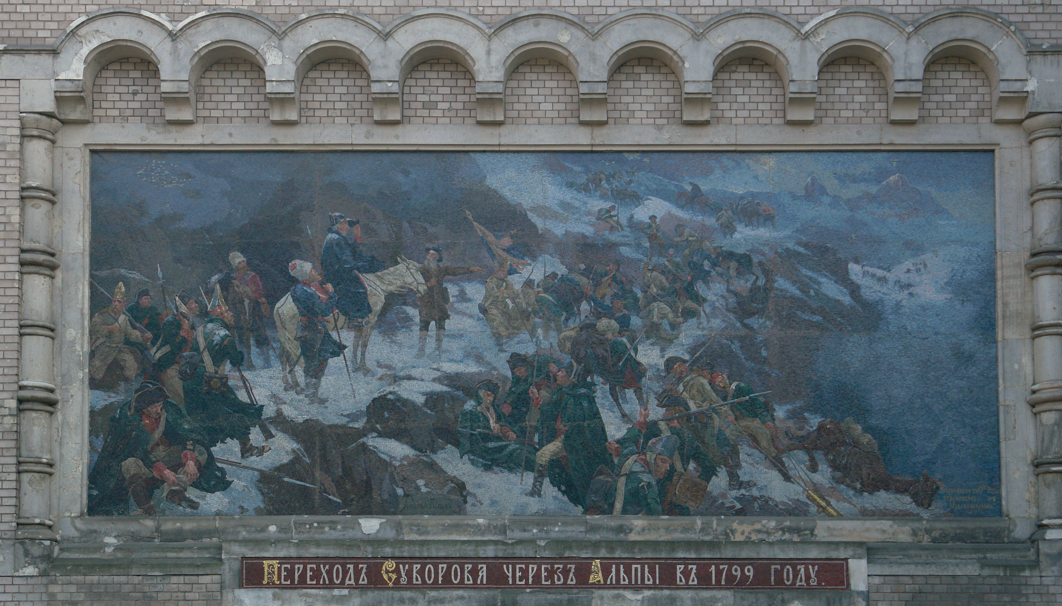 Description: Фасад Государственного мемориального музея А.В. Суворова, мозаика «Переход Суворова через Альпы в 1799 г.», мозаичист Н.Е. Масленников; по эскизам художника А. Н. Попова "Переход Суворова через Альпы". 1904-1904 гг. Кирочная улица 43, Санкт-Петербург, Россия)