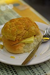 Description: Traditional Hong Kong fastfood: Thick slice of butter in a 'Pineapple Bun'.