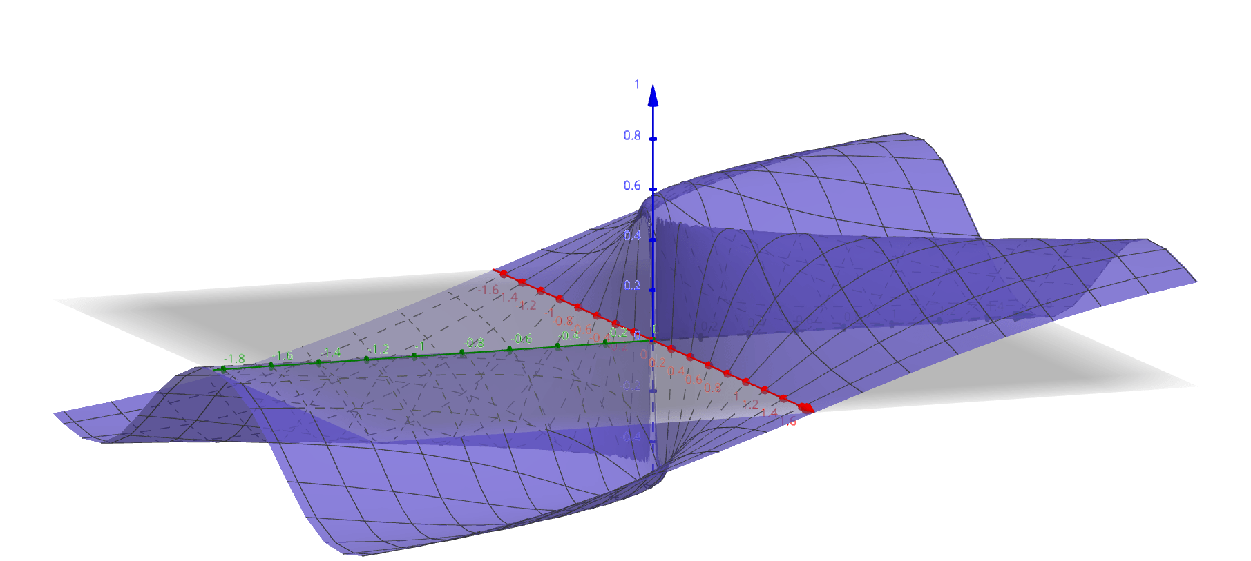 Description: Plot of the function ((x^2)(y))⁄((x^4)+(y^2)). Plotted on the online geogebra 3d plotter