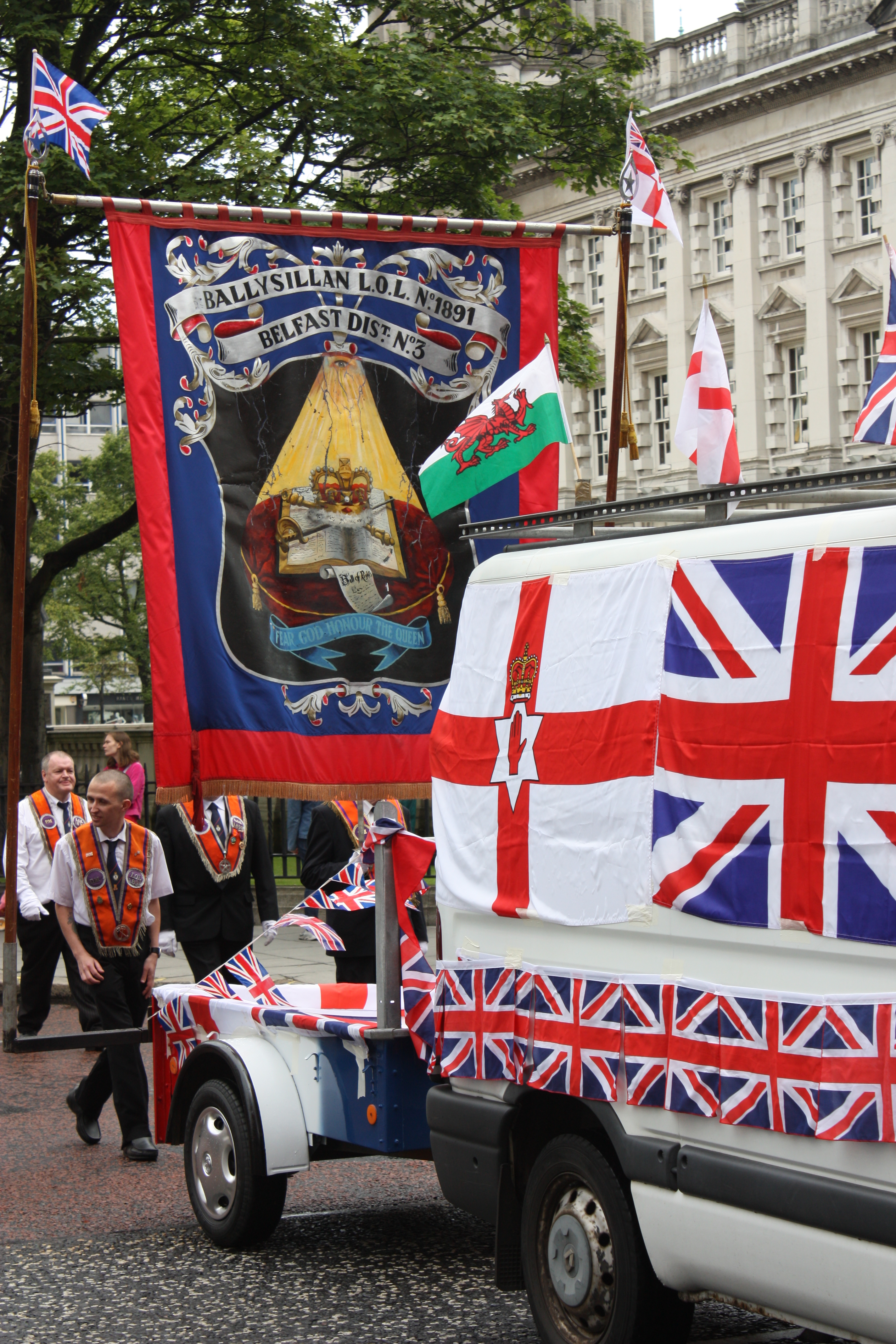 Description: Banner, 12 July Orange Parades, crossing Donegall Square South, Belfast, Northern Ireland, July 2011 (Ballysillan Loyal Orange Lodge 1891)
