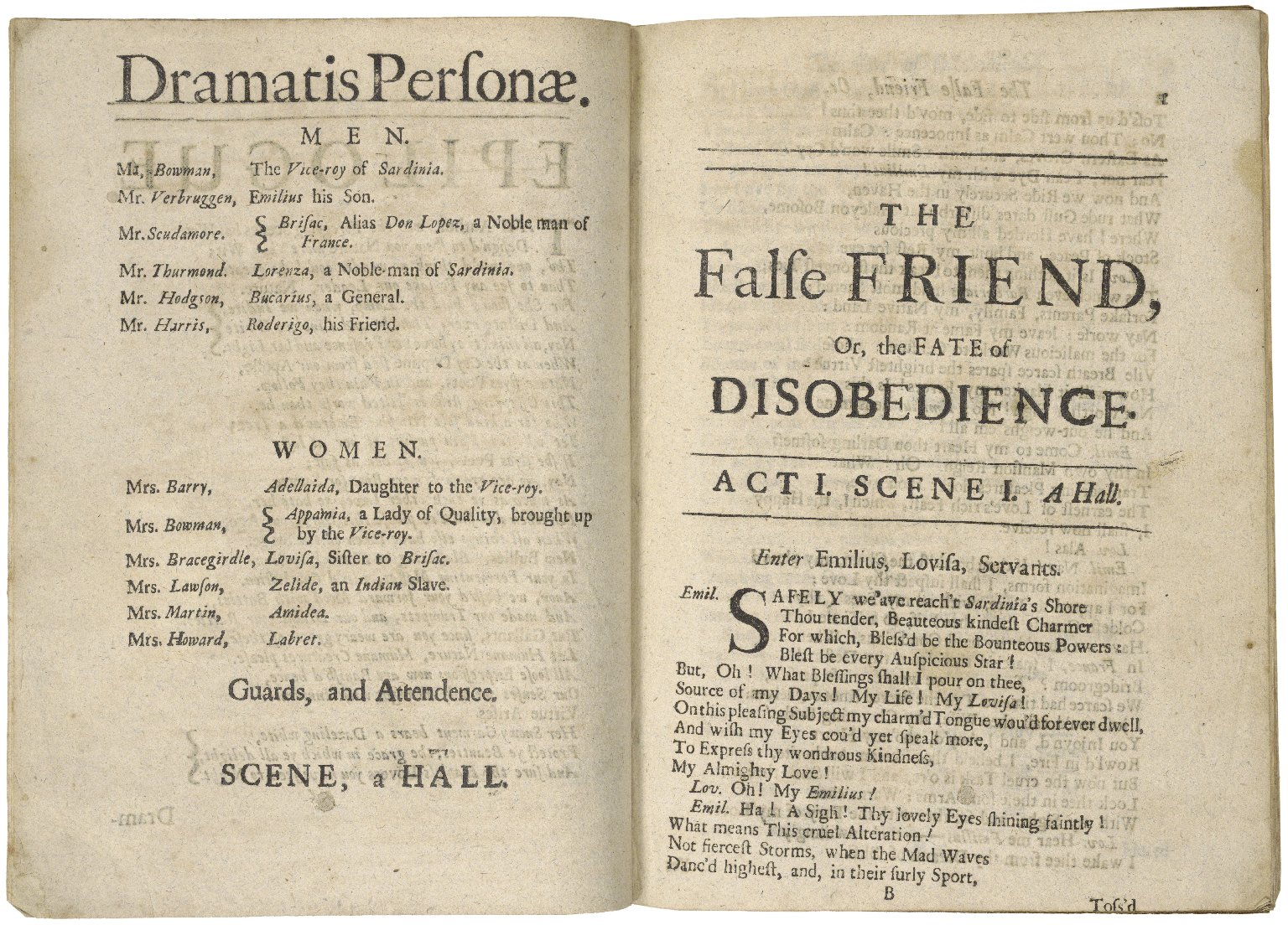 Description: Dramatis Personae from a 1699 edition of Pix's The False Friend.