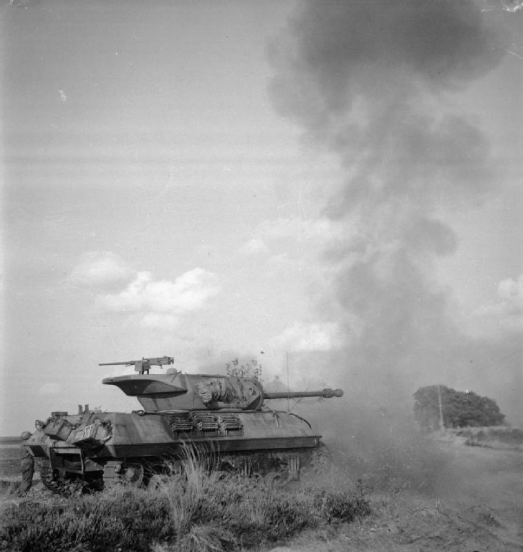 Description: IWM caption : An Achilles tank destroyer of 75th Anti-Tank Regiment, Royal Artillery, 11th Armoured Division, fires its 17-pdr gun at pillboxes on the German frontier.