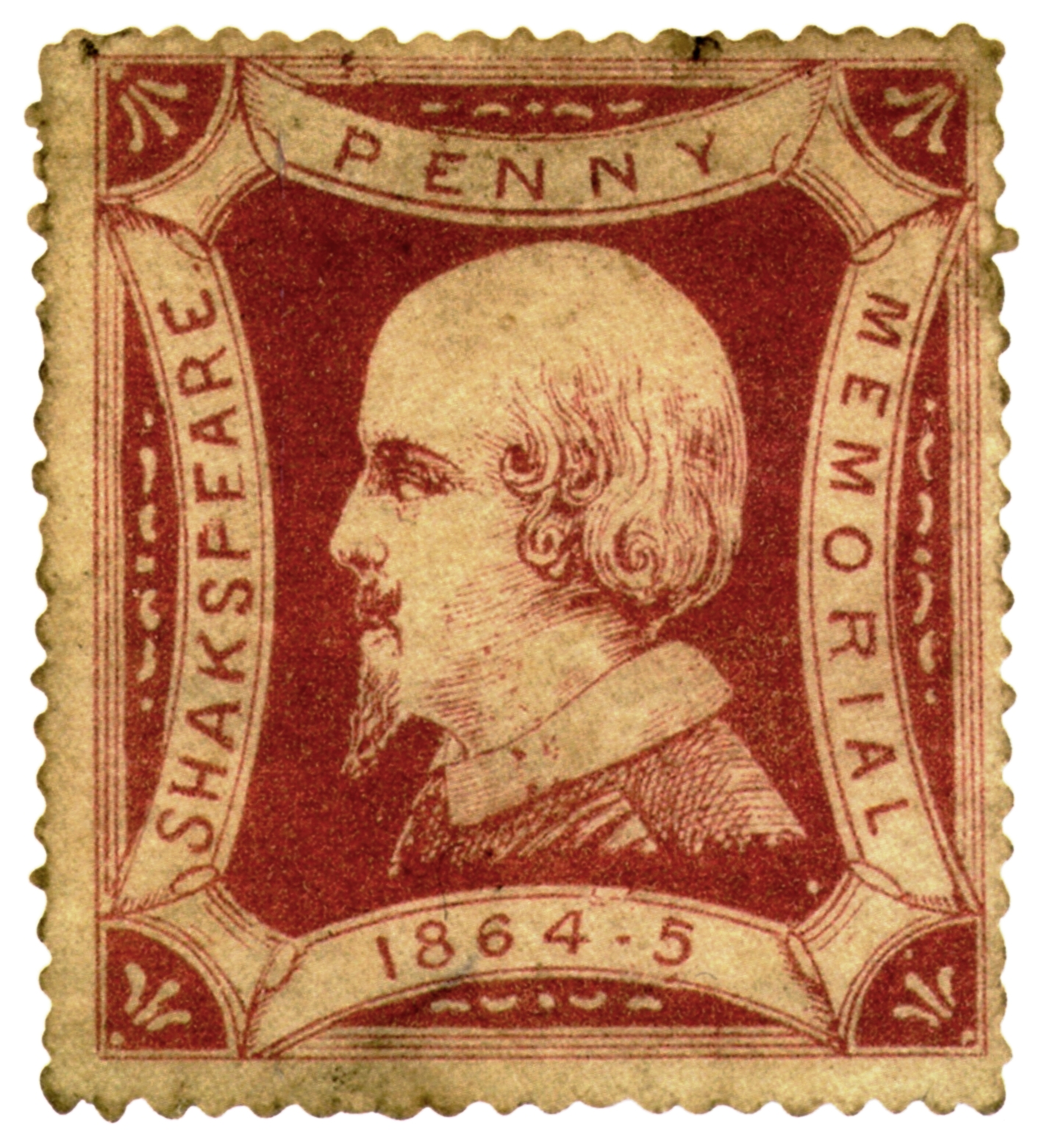 Description: William Shakespeare poster stamp issued in 1864 to note the tercentenary of his birth and raise funds for the Memorial Theatre at Stratford upon Avon.