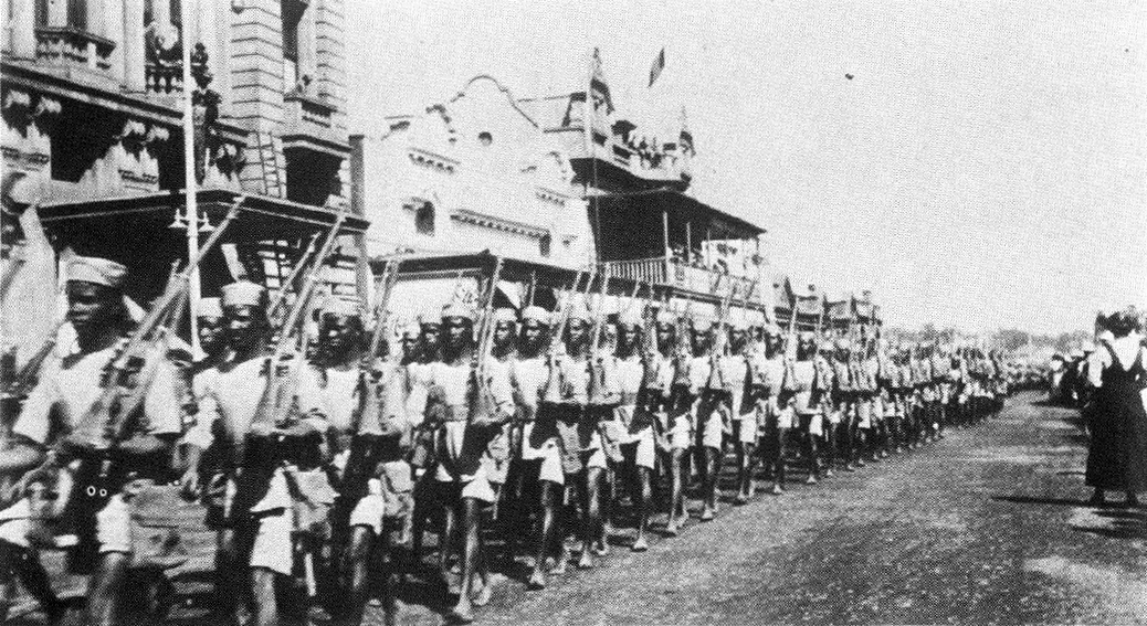 Description: Men of the 1st Rhodesia Native Regiment march through the streets of the Southern Rhodesian capital Salisbury in 1916, prior to going to war in East Africa