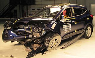 Description: Crash-tested 2010 Hyundai Tucson GLS photographed at the Insurance Institute for Highway Safety Vehicle Research Center. IIHS crash test page