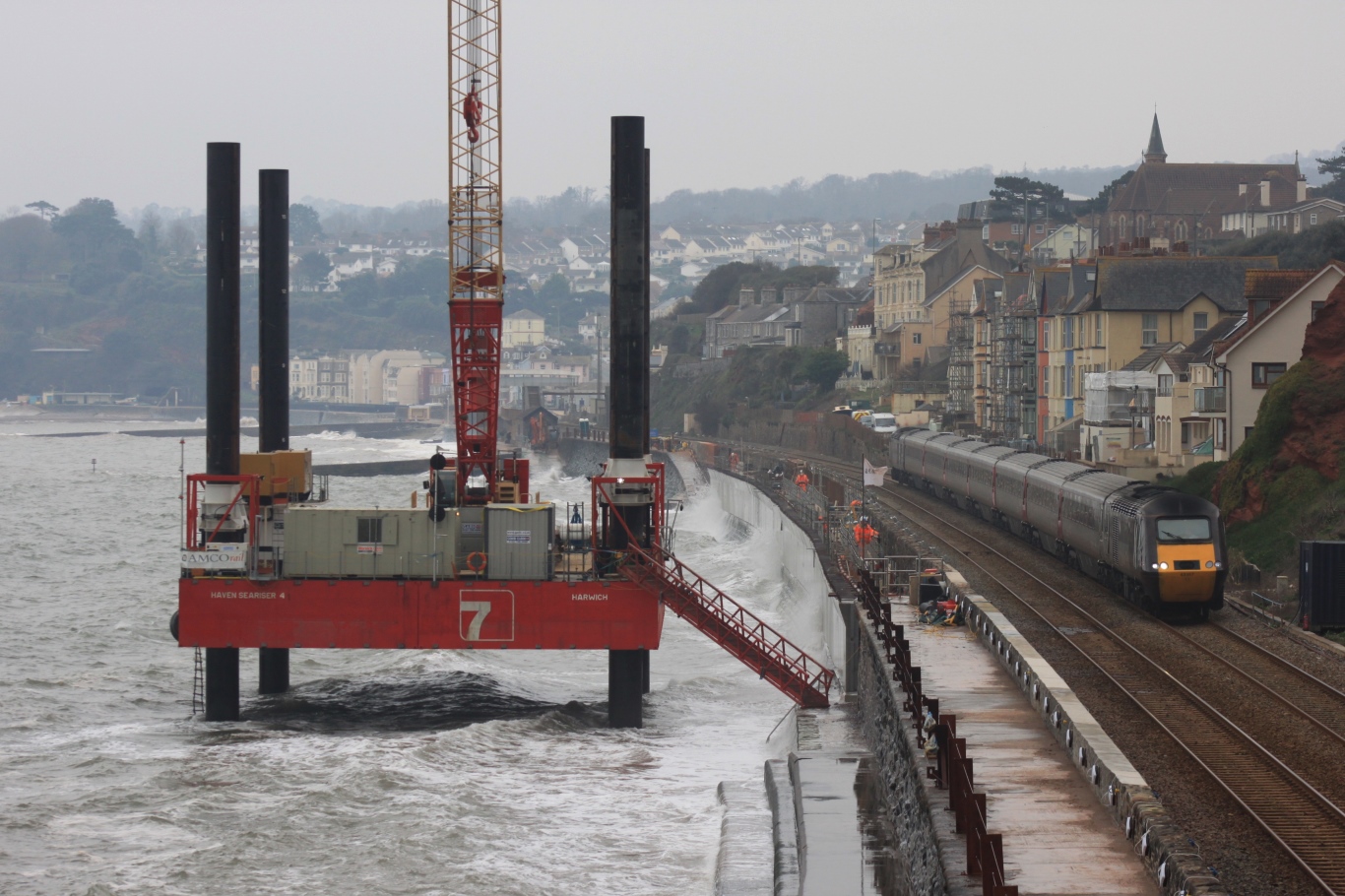 Description: A northbound CrossCountry high speed train, with power car 43357 on the front, passes workers engaged in raising the footpath alongside the sea wall at Dawlish.