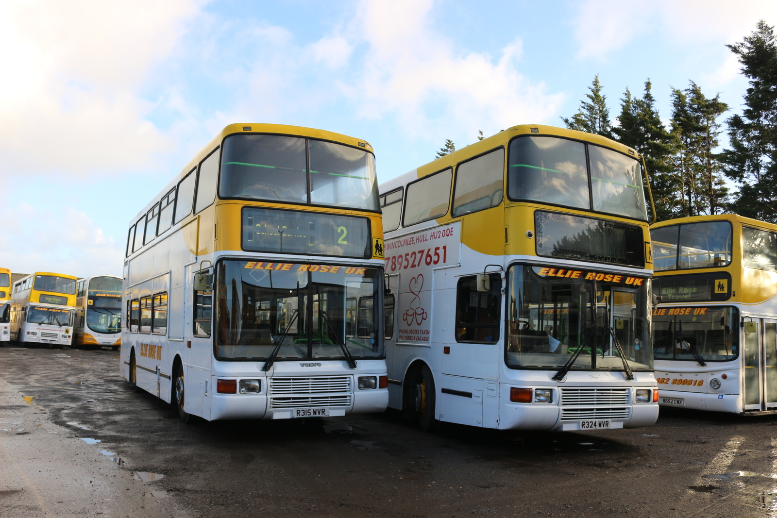 Description: A selection of buses at the Ellie Rose depot in Hull. In the foreground are 2 Volvo Olympians new to MTL, Merseyside