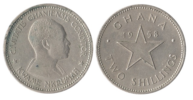 Description: 2 shillings, the Ghanaian pound. Introduced in 1958