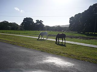 Description: Brumbies grazing by the roadside, Back Beach and Stockyard Roads, Yarrabah indigenous community, north Queensland, Australia